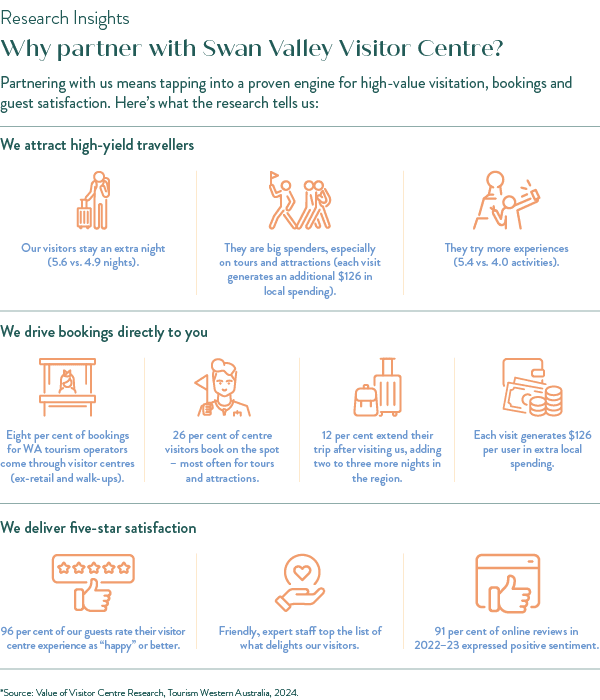 Swan Valley Visitor Centre Tourism Business Partnership Benefits1 July, 2025 - 30 June, 2026Full Swan Valley Partnership Terms |